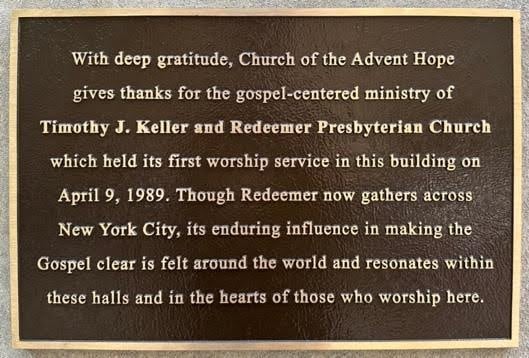 So on Palm Sunday, April 9, 1989, Redeemer Presbyterian Church began to meet there. As the hackneyed phrase goes, “and the rest was history.” Redeemer remained there while it grew, ultimately holding four services each Sunday until 1993. To commemorate the historical start to one of the most successful churches ever planted in New York City, a plaque commissioned by the Church of the Advent Hope was ceremoniously unveiled on Monday, October 6, 2025. A smattering of long-term Redeemer members attended, and the church provided refreshments.